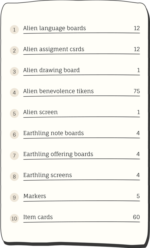 For Aliens, the goal is to collect all the necessary things faster than other team members. For earthlings, it is to get the most benevolence tokens from Aliens for correct offerings. Players will use boards and markers to achieve their goals.