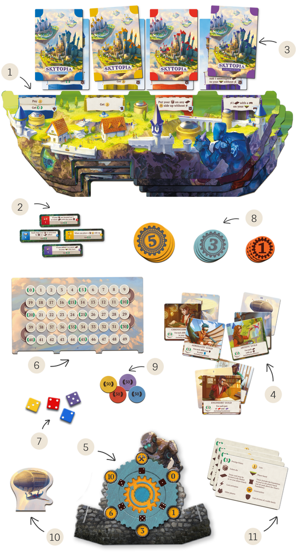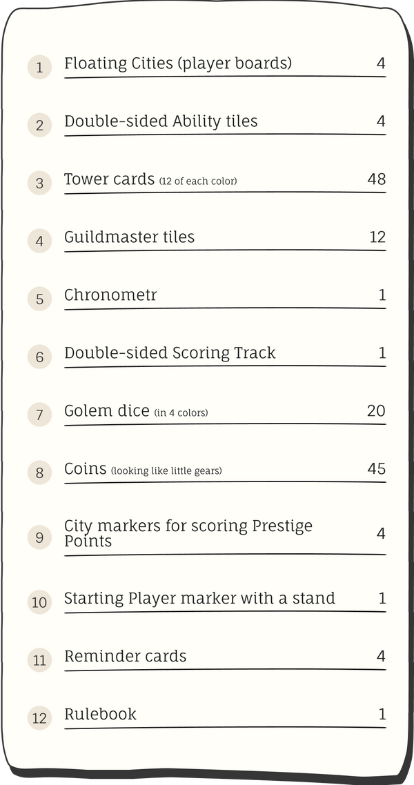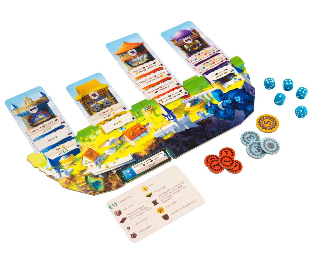 This century, the city leaders awakened the forces of nature — and giant stone Golems arrived to help them with the challenge. In this city-building strategy board game, you will manage your city, build massive towers, and deal with guilds to get as many Prestige Points as possible and lead your city to victory.