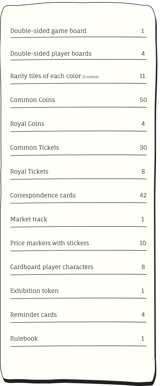 Your goal is to buy and sell paintings, sculptures, jewelry, ceramics, and ancient books with as much profit for yourself as possible and create the most impressive gallery to become an art expert with the most Victory Points.