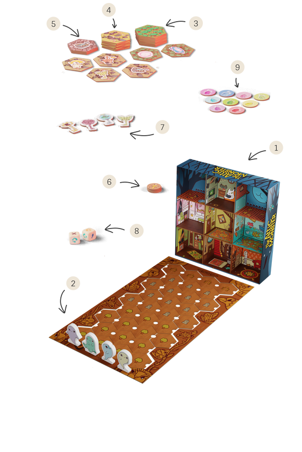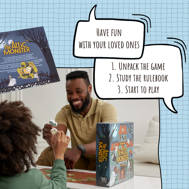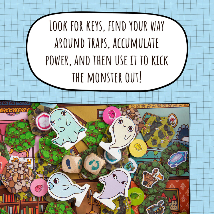 Together with them, you will explore the graveyard looking for keys to the rooms and the attic, find your way around traps, accumulate power, and then use it to get their sweet, spooky home back, sending the ungrateful Monster to its world. But be careful! The Monster becomes more powerful every round.